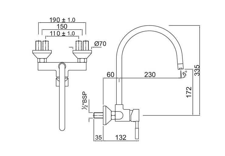 SINGLE LEVER SINK MIXER WITH SWINGING SPOUT ON UPPER SIDE (WALL MOUNTED MODEL) WITH CONNECTING LEGS & WALL FLANGES